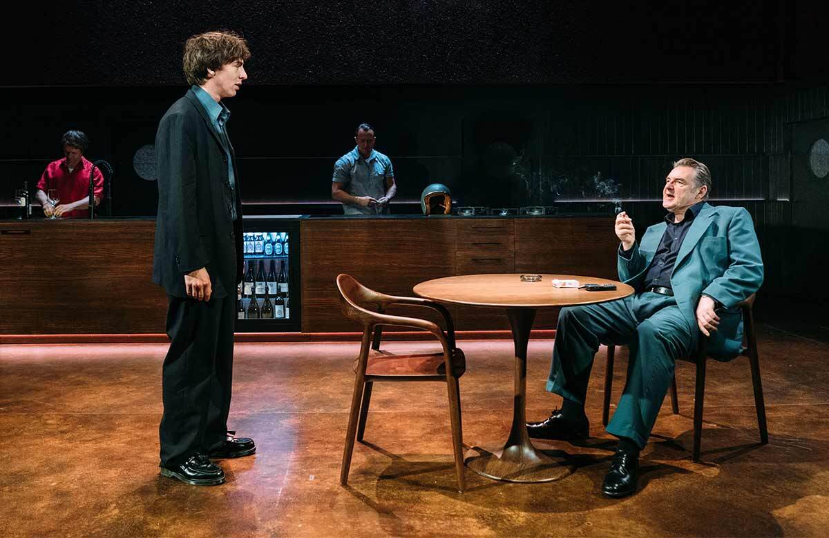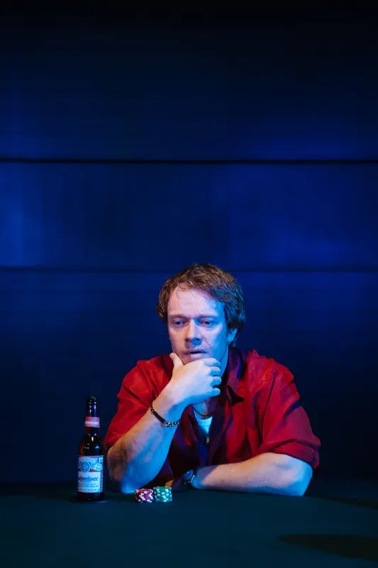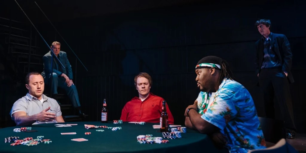 The way the play is structured is brilliant, the first half focuses on the operations of the restaurant as well as establishing the relationships between the six strong cast. Daniel Lapaine is brilliant as the eccentric owner Stephen, mixing moments of humour into agonisingly awkward conversations with his gambling addict son Carl, who is portrayed with so much innocence and emotion by Kasper Hilton-Hille. Their relationship is very intriguing and the pair seem to take the lines and elevate them in every way, playing into the moments of awkwardness and creating a little bit of humour along the roller coaster of their ever developing discoveries about one another. Stephen employs Sweeney as the cook, a man who has to juggle his job and gambling problem with trying to be a good father. Theo Barklem-Biggs is fantastic, he was brilliant in SAS Rogue Heroes as Reg Seekings, and we see similar moments of fury in his performance within the play. He plays his part very well and his relationship with Alfie Allen’s character Frankie is hilarious yet also twisted and it sometimes seems like an extremely toxic relationship. Alfie Allen is a very good actor who does stand out significantly as he silences the audience with his random moment of rage in the second half. The second part of the play is set in the basement as we watch the intense emotions of poker, and we discover the intricate details and inward emotions of the characters.