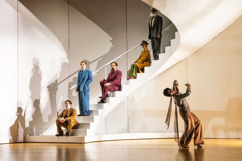 My true favourite was Ru Charlesworth as the charming Prince Emilio, Partenope’s enemy/friend. He was wearing a piece of paper on his face for most of the first act, which I have to admit confused me, but also added to the surrealist landscape. His character was delightful to watch, wielding a camera or putting posters of naked women up on the wall. He was confusing but ever so funny as he began to tap dance in order to declare war on Partenope, or place a large pink frame on the wall. I wish I could pretend to know what this meant but it was still surrealist and entertaining.